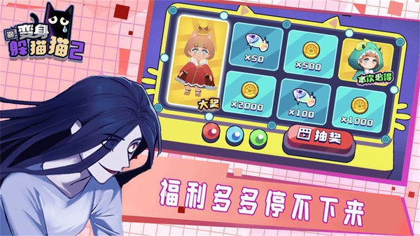 变身躲猫猫2最新版作为躲猫猫题材类型的休闲趣味游戏,拥有着精致卡通的风格画面和人物角色,呈现出不同的主题场景,还打造有趣的玩法内容,提供多种玩法模式,有各种面怪物需要躲避,更多福利可以赢取,操作起来灵活易上手!