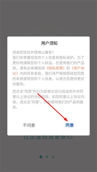 1、打开山餐安app,在弹出的用户须窗口中,点击同意按钮。