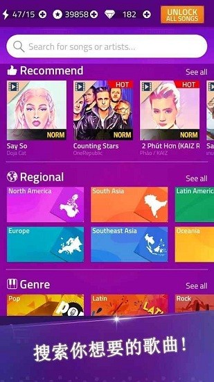 3、游戏中每一首曲目就是一个关卡,种类丰富,难度也不一样,尽量获得高分吧。