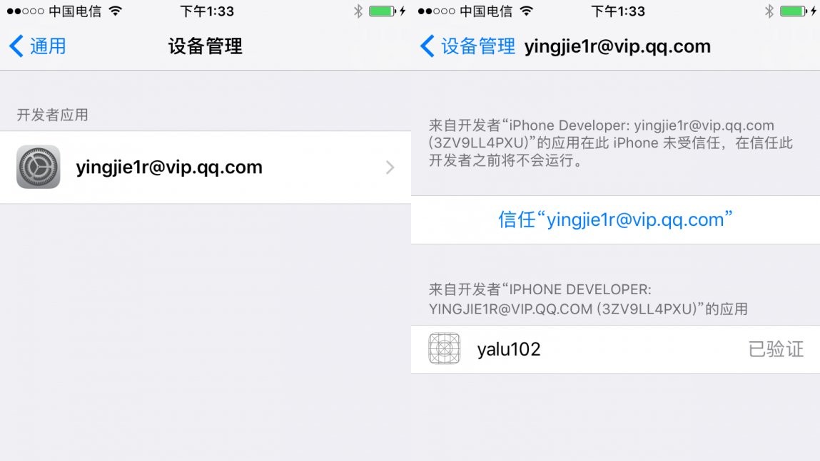 7:此时 cydia impactor 会先对此app进行签名,然后会自动将签名后的越狱app 安装到您的手机,可以在手机桌面看到 yalu102 的白色图标,这个就是越狱工具