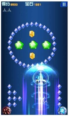 3.滑动屏幕控制你的战机移动,拾取敌机死亡后爆出的钻石和道具;