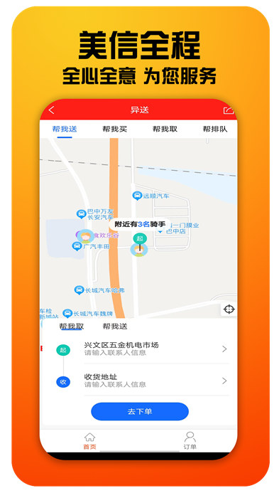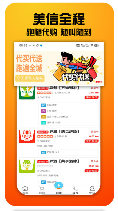 美信全程是一款同城点餐、超市代购应用,方便快速订餐。你带来24小时在线服务,使您可以随时随地订购外卖,或是选择跑腿服务。不管哪一种订购哪一种外卖商品都能享受外卖配送服务,在家在任何地方可以享用同城各种外卖商品。可以在此找人帮自己代买、代取送和代办事,跑腿代办的服务可以随时体验!