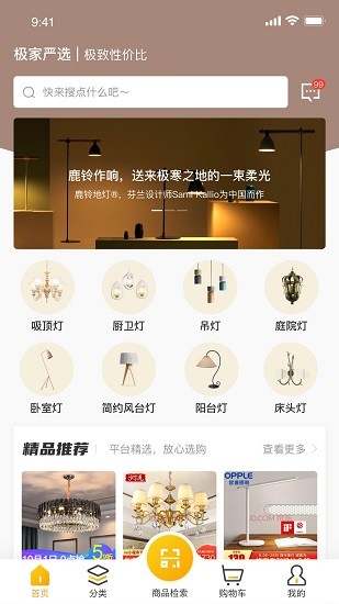 极家严选软件是非常好用的家庭生活类购物app,在这里用户们能够找到超多家居类灯具商品进行购买,顶灯、壁灯、地灯、台灯、玻璃灯、床头灯、卧室灯、厨卫灯等等等等全都能够快速的下单购买,所有的商品全都是正规厂家生产的正品,超级的好用。