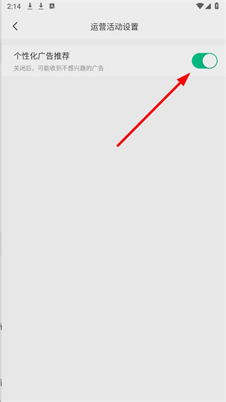 4、在运营活动设置页面,点击右侧的开关按钮,将其切换为关闭状态,即可减少个性化广告推送。
