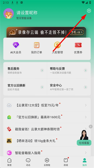 1、打开360智慧生活app,进入我的页面后点击右上角设置图标,进入设置界面。