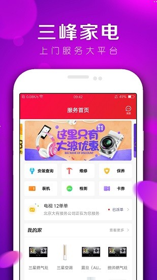 三峰家电软件是非常全面的一款家电类型的手机app,在这里用户们能够找到超多的家电商品进行购买,电视、冰箱、空调、洗衣机、燃气灶、数码电器、手机、电脑等等等等商品全都能够找到。用户们还能够通过软件直接线上下单家电维修,帮助用户们可以更好的找到维修人员,超级的好用。