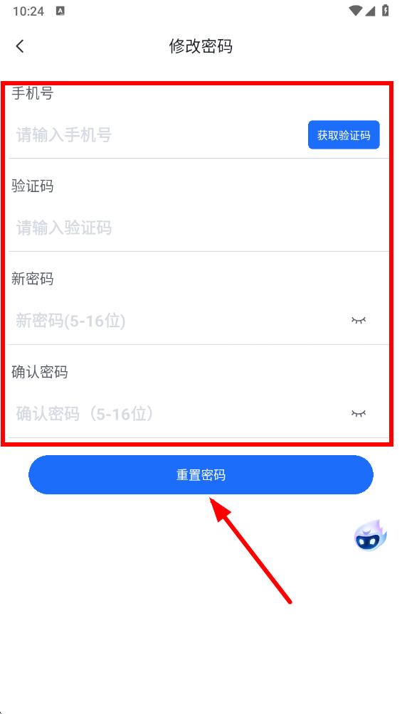 4、进入修改密码界面后,输入手机号并获取验证码,接着设置密码,点击重置密码,即可完成密码修改操作。