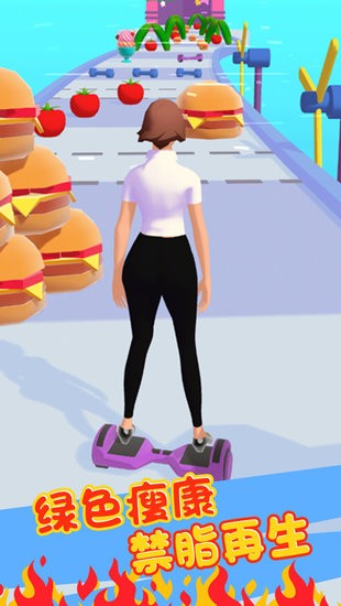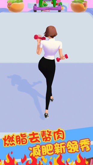 玩家通过吃汉堡,番茄,冰淇淋,热狗,举哑铃,跑步机,跳神等各种方式玩法,达到标准身材后,走到终点,获得胜利,如低于或高于标准要求,则失败!