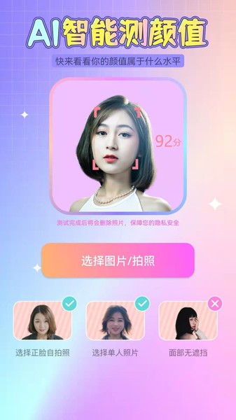 识颜app趣味的相机软件,智能的测颜值,在线的给用户时光变老的看看你老年的养殖,玩法非常的多样,简单的界面上手非常的简单,还可以进行皮肤的检查让你更好的护肤管理,感兴趣的玩家就来下载试试吧!
