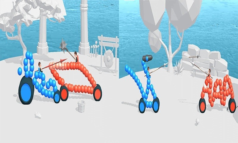 你可以利用气球打造出很多形状各异的汽车。游戏中玩家可以自由放置,没有限制。你也可以根据对手的汽车弱点改装赛车,非常的自由。