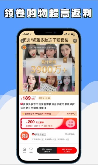 2.包括每日推荐、精选优品、一元购、白菜价、好单库、9.9包邮、直播间、商城等各个模块,每天更新上万件优质商品。