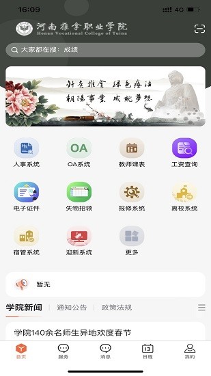 河南推拿职业学院移动APP“我i河推”集成了校内各大业务系统、管理系统、办公系统实现校园app一体化,打破了信息壁垒、实现了数据共享,一个账号畅通无阻,为河南推拿职业学院师生提供一站式的校园移动服务。