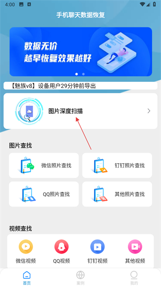 1、打开手机聊天数据恢复应用,点击图片深度扫描选项。