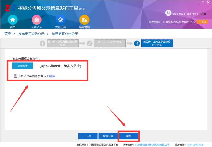 全国招标公告公示标准发布工具客户端支持在电脑上发布公告公示信息,可以发布和更正,支持生成PDF文件并进行下载打印,可以发布的内容包括招标公告、中标候选人、中标结果、更正公告、资格预审公告等,欢迎有需要的朋友下载使用!