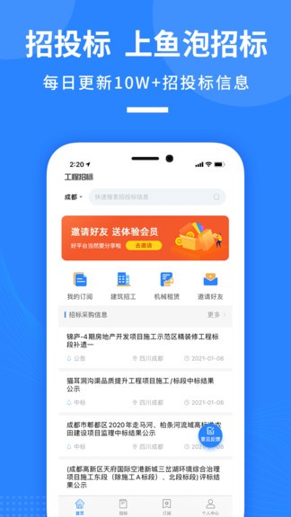 鱼泡招标网app最新版实时推送最新的招投标信息,行业全覆盖,用户可以添加关键字来订阅,精准推送你想看的,项目进度实时可查,建筑招工、机械租赁等服务应有尽有,可以查看详细的招标明细,欢迎感兴趣的朋友下载使用!