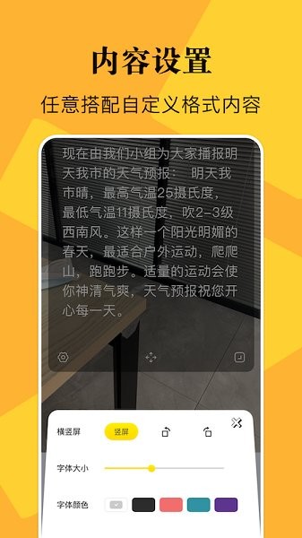 说的相机提词器app给用户带来的提词服务软件,用户可以自定义你的字体,颜色,选择合适的背景让你的提词更加的明显,字体滚动轮播非常的方便,有需要的用户就来下载试试吧!