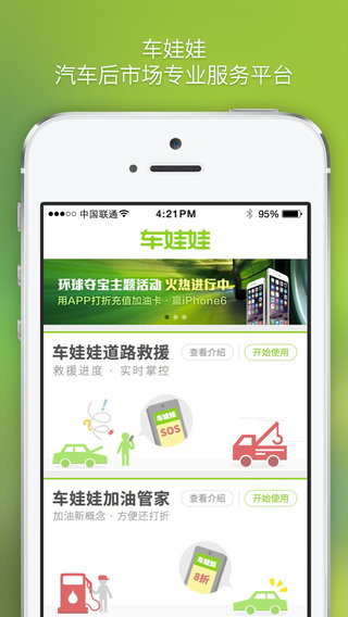 车娃娃软件手机版为汽车车主提供了全方位的汽车服务,包括优惠加油,道路救援、汽车维修、查违章、办理汽车延保等,还有贴心的维修案例可供车主来参考,你想要的,这里都有,欢迎有需要的朋友下载使用!