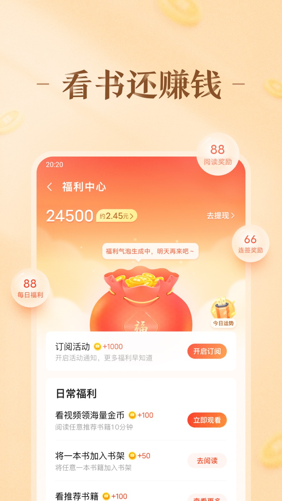 海量网文小说供用户永久免费阅读,系统会根据用户的喜好进行推荐,还能够自动记录用户的阅读位置,在应用中会不定期的有海量的小说上线,为您带来更多的优质的阅读选择。