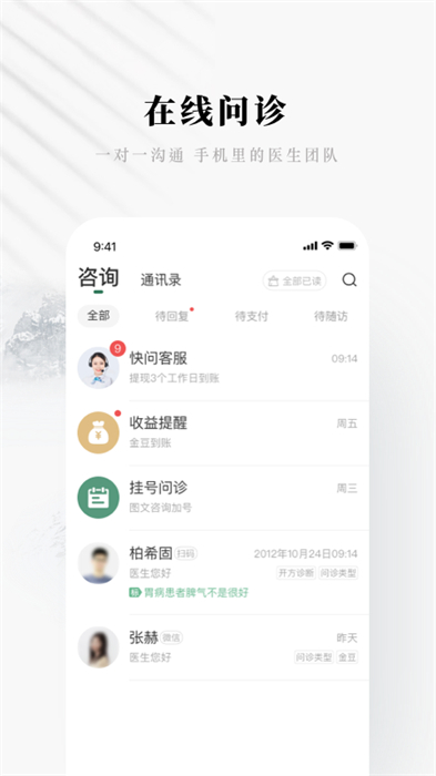 快问医生端app给用户带来的线上的医疗办公服务,在线的进行的咨询问答,线上的就诊复诊帮助用户快捷的管理患者,软件每天给用户带来的丰富的健康资讯服务让用户从生活的习惯管理健康,快来下载试试吧!