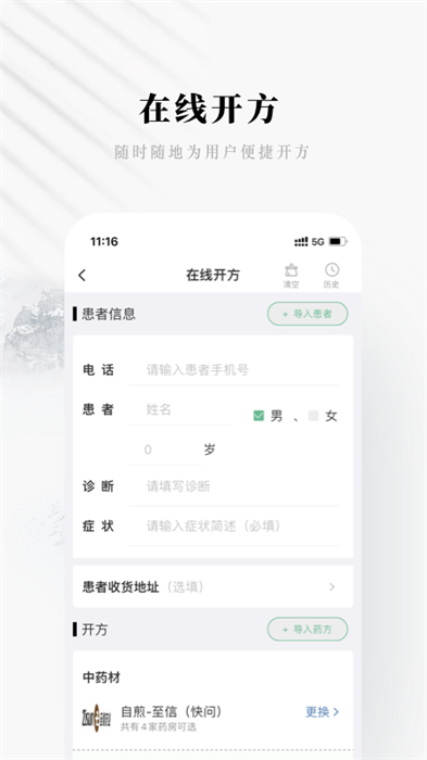 二、移动处方系统,模拟方剂模板,让名中医身在世界任何一个角落,均可为有需要咨询的人提供中医问诊服务,健康方案,并由至信药业统一发药,通过快递送药上门。