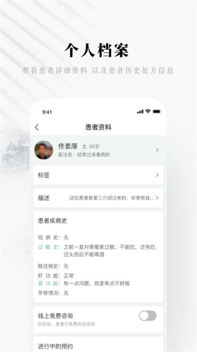 2、线上复诊再也不用跑医院了,帮助医生线上工作,在线管理患者资料,提供健康调理方案。