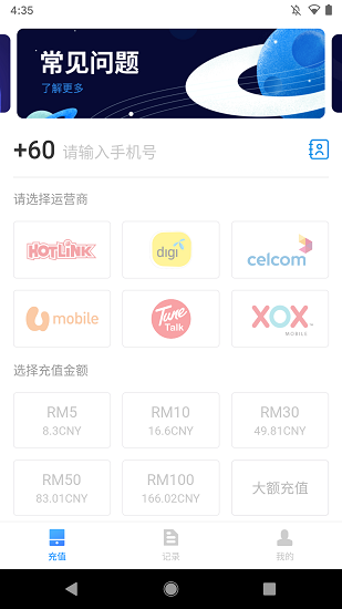 充值,在这里面选择运营商、选择你需要充值的金额就可以快速的来进行充值了,和在咱们中国的话费充值是一样的操作过程。