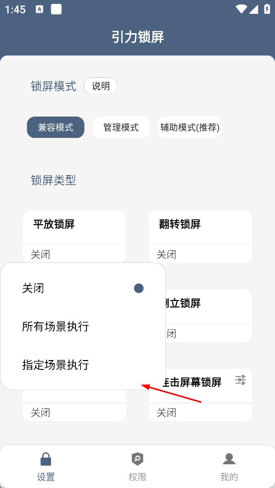 2、点击后弹出选择框,按需选择“所有场景执行”或“指定场景执行” ,完成锁屏条件设定。