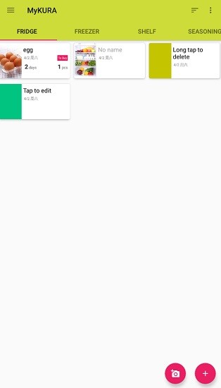 mykura app软件可以有效的记录和管理冰箱里的食材,很多时候我们会忘记冰箱里的食材什么时候过期,这就造成了一定的食品安全隐患,此软件可以帮助用户设置和录入有效期,可以拍照上传,支持语音记录,可以查看到每种食品的详细保质天数,欢迎有需要的朋友下载使用!