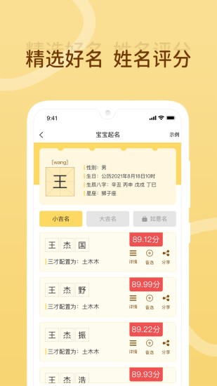 2、自选名字专区服务功能,多种名字以供参考,可对比进行选择。