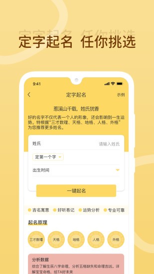 宝宝起名神器大全免费为你提供非常多的起名服务,线上的起名模式多种多样,无论你想怎么给孩子起名都是可以的,根据生辰八字姓氏来自动生成名字,系统会匹配最优质的名字推送给你,你可以查看名字的具体解析,还能随时切换名字,欢迎有需要的朋友下载使用!