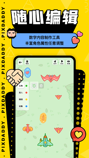 丰富的角色属性可以通过编辑器自由的设置,无论是角色的移动轨迹、移动速度、控制方式、特效、主题背景等都可以随心编辑,玩起来更有趣。