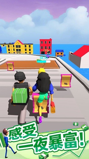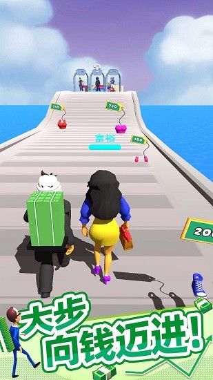 是一款趣味性十足的跑酷闯关休闲游戏,3D精致游戏画面简单操作玩法,玩家可以通过收集的钞票在前进的路上购买各种不同的物品或者服饰,让你在游戏关卡的结尾成为超级富豪顶级富翁。