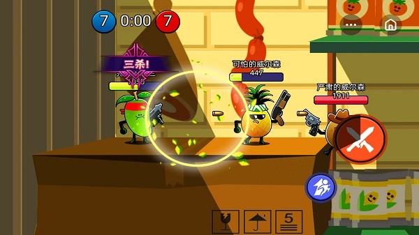 3V3组队对战吃鸡大乱斗,这是一款3人组队对战射击MOBA游戏,玩家扮演呆萌可爱的水果人,拿起手中武器在规定时间内击败敌方次数最多的一方即胜利。