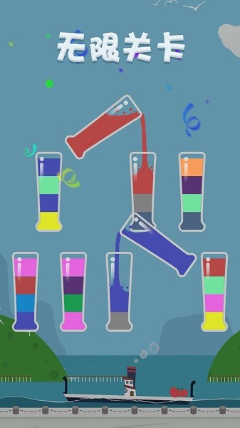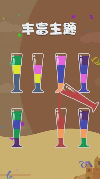 有趣且令人上瘾的益智游戏, 尝试将玻璃杯中的有色水分类,直到同一玻璃杯中的所有颜色都是同一种颜色。