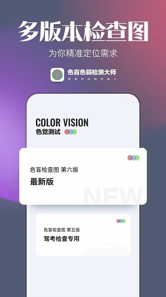 本应用含有色盲色弱自测,颜色矫正测试,以及完整的第五版、第六版检查图。(ps:测试结果仅供参考)