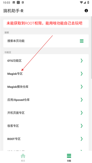 2、在功能页面中,找到并点击Magisk专区选项,进入Magisk相关功能界面。