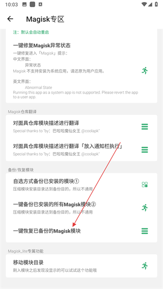 3、在Magisk专区界面里,找到一键恢复已备份的Magisk模块选项并点击。