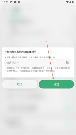 4、在弹出的窗口中,选择已备份的Magisk模块文件,然后点击确定按钮。