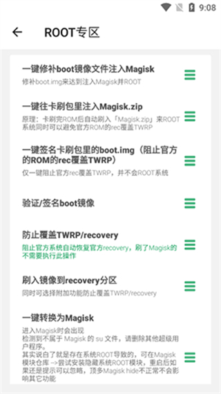 Magisk仓库翻译,支持兼容模式(无需改动直接刷入旧模块)、单个/批量刷入某个目录里的全部Magisk模块、一键将系统ROOT转换为Magisk(即使在无Recovery情况下)、一键备份/恢复Magisk模块、支持一键更新Magisk至最新稳定版本、一键安装Riru-Code、一键安装EDXposed、MIUI专属模块、机型伪装模块、一键安装存储重定向增强模式模块、一键安装AD-Hosts模块、一键安装2.4GWiFi加速模块、一键转换为太极·阳、一键永久关闭SELinux,(和临时关闭)、全面屏手势导航、一键永久激活快否,一键将系统ROOT转换为Magisk
