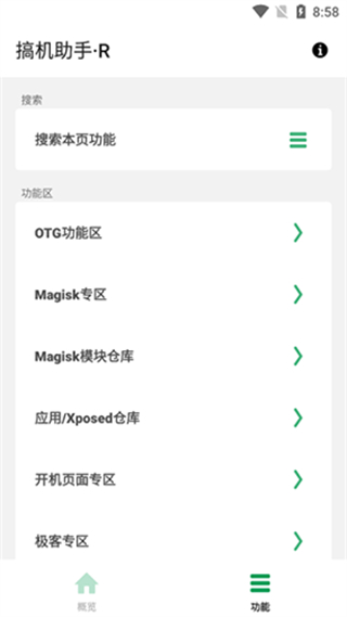 搞机助手·R是一款免ROOT功能的玩机工具,支持覆盖率40%,root功能,支持覆盖率70%,Magisk功能,支持覆盖率100%的超强工具合集,内置超多xp框架、面具模块、美化工具等资源。