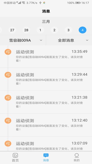运动侦测:控制设备侦测到运动物体自动录像发通知。
