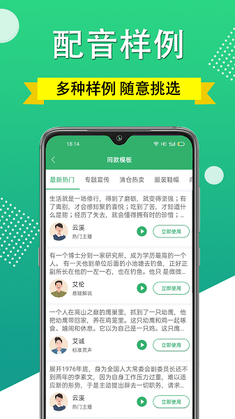 多个合成主播:众多智能语音合成机器人,男声+女声+童声随意切换,多种发音人任您选择。