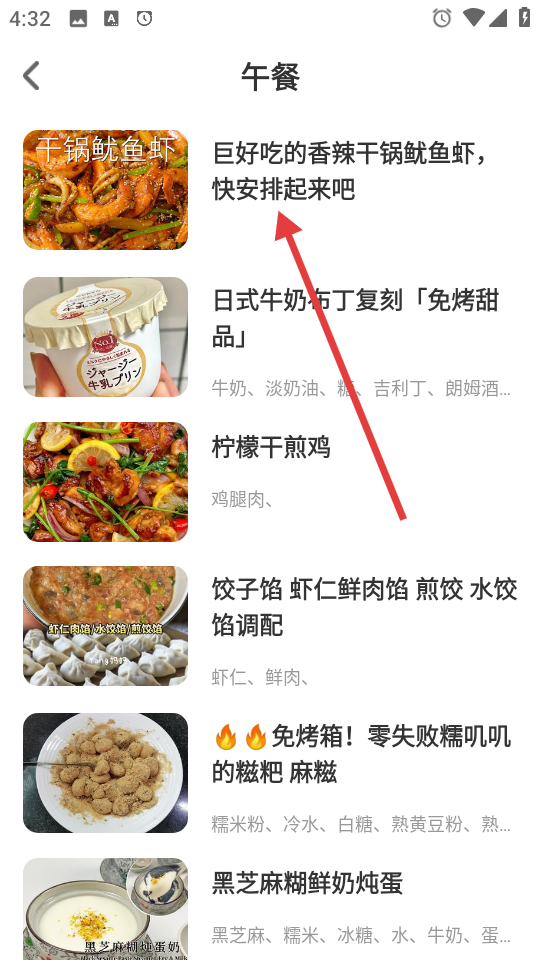 3、进入午餐页面后,浏览并点击如巨好吃的香辣干锅鱿鱼虾,快安排起来吧感兴趣的菜谱。