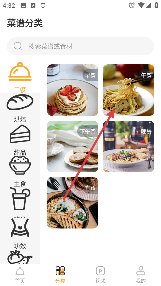 2、在菜谱分类页面,点击午餐等分类板块选择餐食类别。