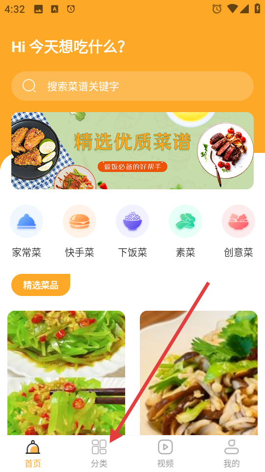 1、打开家常美食菜谱App,点击底部导航栏中的分类进入分类页面。