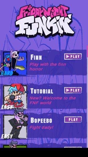 黑色星期五之夜打败佩皮模组加入了全新的角色,玩家将要和佩皮一起进行音乐对战,打败它之后才能解锁后面的内容,游戏采用闯关制玩法,可以和bf、pico、索尼克、波比、腐败岳父等多个角色对战,每个人物都有几种不同的难度可以挑战。