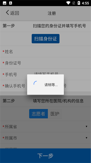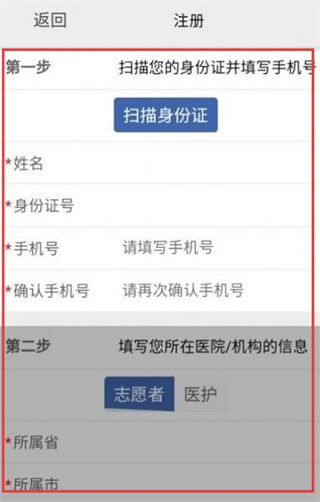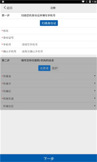 2、进入注册页面,第一步扫描身份证信息,第二步选择身份,填写所属省、市等机构信息。