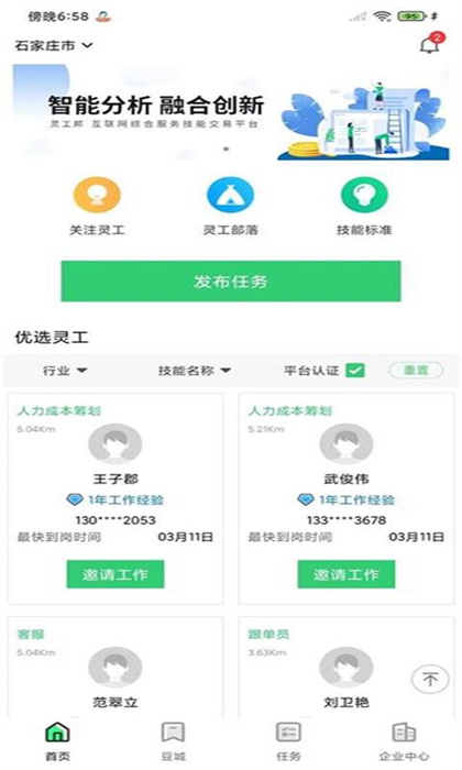 灵工邦是为企业、个人提供一站式互联网众包服务的综合应用平台。通过平台企业能够随时随地发布多种类型的工作任务,根据职业类别为自由职业者精准匹配适合的工作任务,实现任务执行过程和结果在线监管、灵活用工多元化,帮助企业增效降本,为个人赋能创收,打造全新的灵活用工模式。