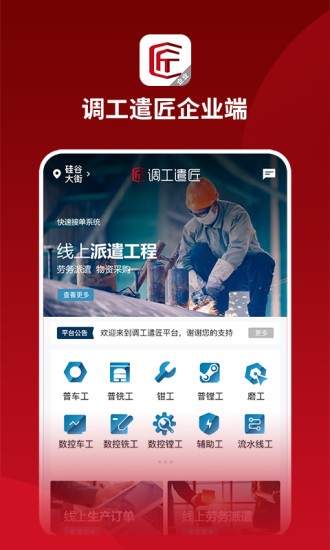 调工遣匠—可靠的灵活用工、生产订单及标准件采购平台,围绕互联网+工业平台运营、工业制造业、技工人才、企业发展的灵活用工需求,打造了线上订单版块、用工版块、商城版块、教育版块、劳务版块等多项细分产品,帮助生产企业解决现存问题,形成完整的服务闭环。