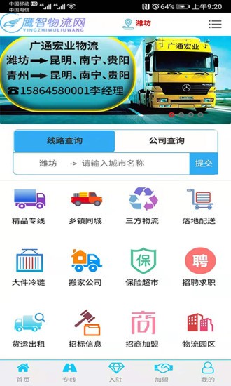 【鹰智物流网】是集【精品专线】、【三方物流】、【落地配送】、【大件冷链】、【同城配送】、【搬家公司】、【货源】、【车源】、【物流园区】、【招商加盟】、【招标信息】、【周边服务】、【新闻资讯】等栏目于一体,致力于打造物流行业多方位综合性服务平台。平台汇集数十万条专线线路,入驻数万家物流企业 、囊括众多物流行业信息,通过互联网、大数据、人工智能技术对信息分类整理,具有搜索、查询、入驻、推广功能,可以满足中小型物流公司及物流相关企业的广告宣传需求。找物流、做推广就上【鹰智物流网】!